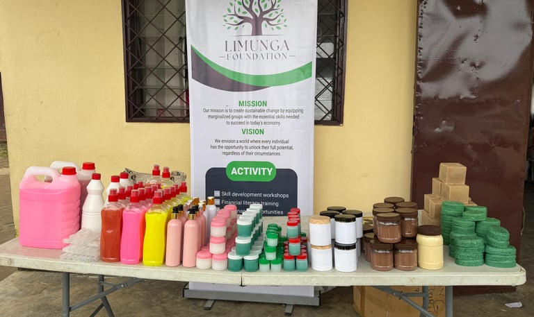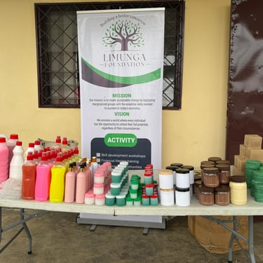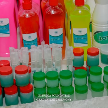 At Limunga Foundation, participants gain hands-on training in practical income-generating skills such as soap making (including liquid soaps for personal care and dishwashing), chocolate production, Javel making, and more. These skills empower them to start and grow their own small businesses, fostering financial independence and self-reliance.